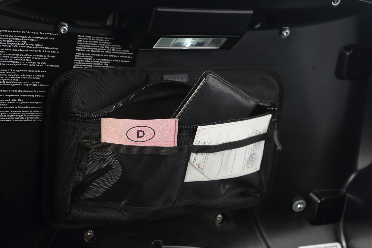 Dimensions: 29x18 cm Case lid pocket for all side and top cases. One main pocket and two outer compartments. Lightweight, strong attachment through two interlocking fastener pads. The pocket can be quickly removed and reinstalled. CORDURA (top side). Water and abrasion resistant. Teflon coated underside.For all top cases and side luggage.
