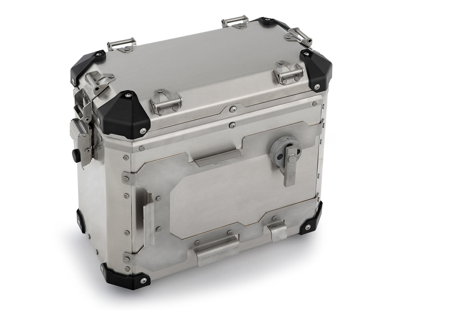 Nos coffres en aluminium EXTREME slimline, stables, légers et au style assuré vous accompagnent pour le meilleur et pour le pire! La fixation sur le support est, grâce au système d'attaches rapides, sans difficulté. De par leur système d'étanchéité spécial, ils sont absolument étanches à l'eau et à la poussière. En raison de l'utilisation systématique de matériaux de haute qualité, la longévité de notre système de bagages EXTREME est garantie. Contribuent à cette garantie : la tôle d'aluminium traitée de 1,5 mm à moulures de stabilisation (au poids optimisé, mais cependant robuste), les raccords en acier inoxydable, la protection intégrale échangeable sur tous les coins ainsi que les capuchons de protection des serrures.