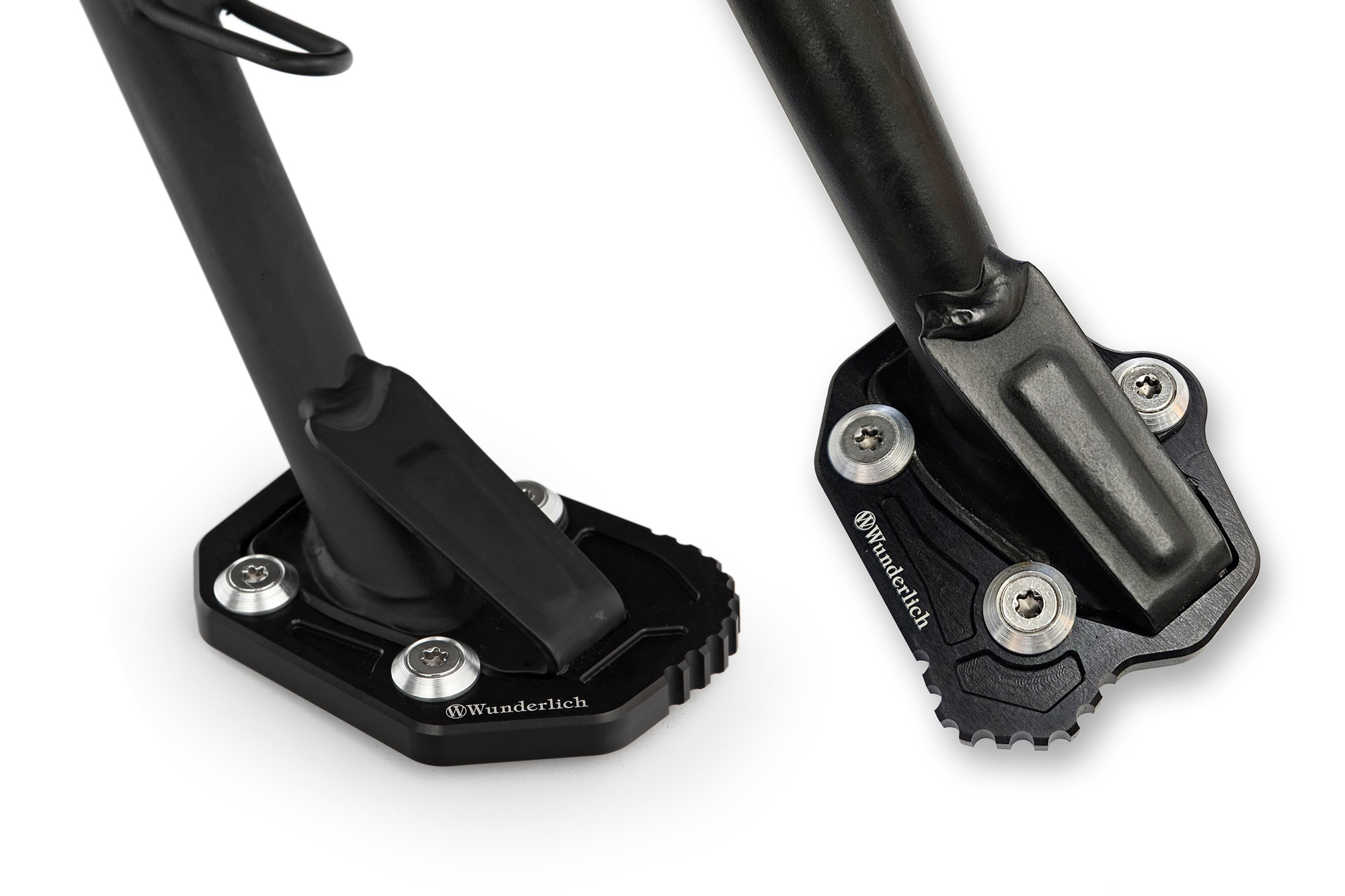Sie sind eine Art Lebensversicherung – die Seitenständer Auflagenvergrößerungen: Durch die kleine Aufstandsfläche der Original-Seitenständer besteht die Gefahr des langsamen, häufig unbemerkten Einsinkens sowohl auf heißen Teerflächen als auch bei nur leicht aufgeweichtem Untergrund. Die präzise formgefrästen Auflagenvergrößerungen, die einfach an den Seitenständer der Ducati Multistrada V4 geschraubt werden, beseitigen wirkungsvoll diesen konstruktiven Mangel. Und damit der Seitenständer locker mit der Stiefelferse ausgeklappt werden kann, hat Wunderlich eine Außenverzahnung eingearbeitet.