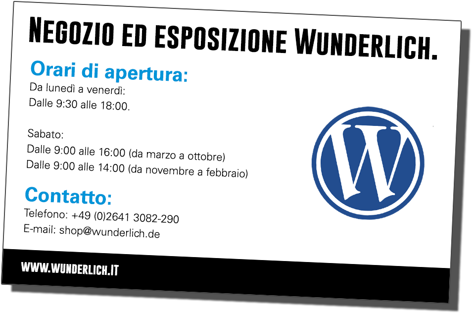 Il nostro negozio presso la sede dell'azienda è aperto per voi e non vediamo l'ora di vedervi! Scoprite il grande mondo del marchio Wunderlich e le ultime novità del nostro vasto assortimento.