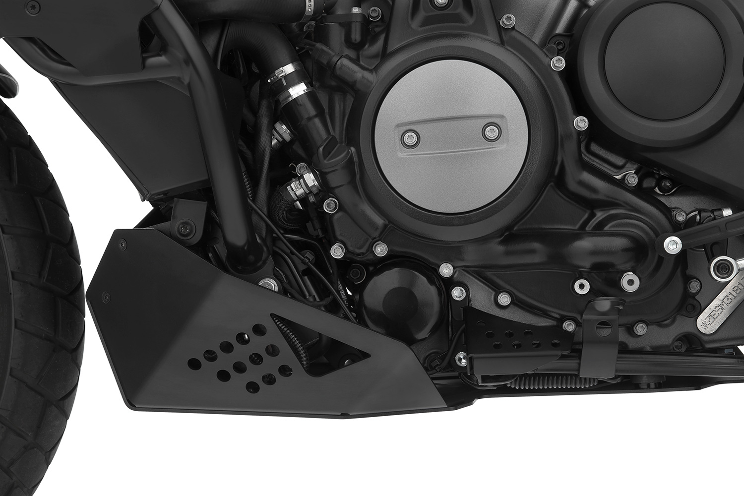 L'attacco a vite incassato sottolinea al meglio lo stile Adventure. La protezione verniciata a polvere nera avvolge saldamente il motore, assicurando la massima distanza dal suolo e la massima inclinazione. La forma della protezione evita spiacevoli disarcionamenti o incagli nel fuori strada, anche in presenza di rami, ciottoli o pietre. Le aperture assicurano un deflusso dell’acqua accumulatasi in caso di guado. La protezione motore in alluminio è resistente alla corrosione e distribuisce le forze d’urto e d’inerzia ai supporti ammortizzati per ridurre i picchi di carico. Le vibrazioni vengono assorbite efficacemente dai Silent Block.