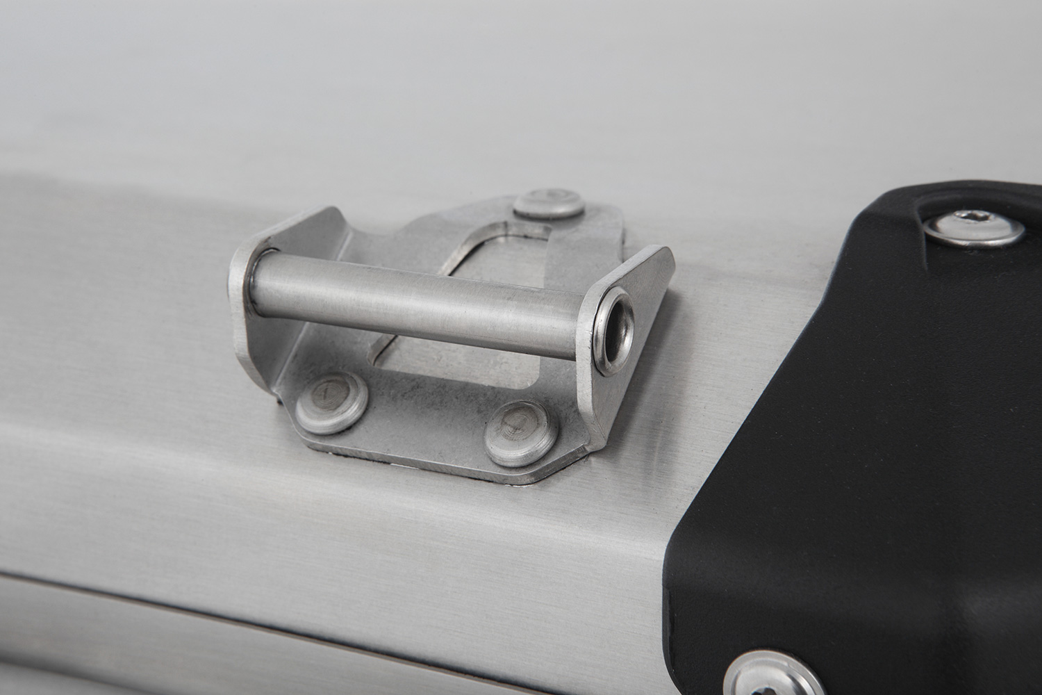 Nach dem Öffnen der beiden, jeweils vorne und hinten angebrachten, Scharnierschlösser kann der Deckel komplett entfernt und die Koffer können bequem von oben beladen werden. Wird nur eines der beiden Schlösser geöffnet, dient der zweite Verschluss als Scharnier. So lässt sich der Deckel wahlweile nach vorne oder hinten aufstellen und wird dabei durch ein Fangseil gehalten.
