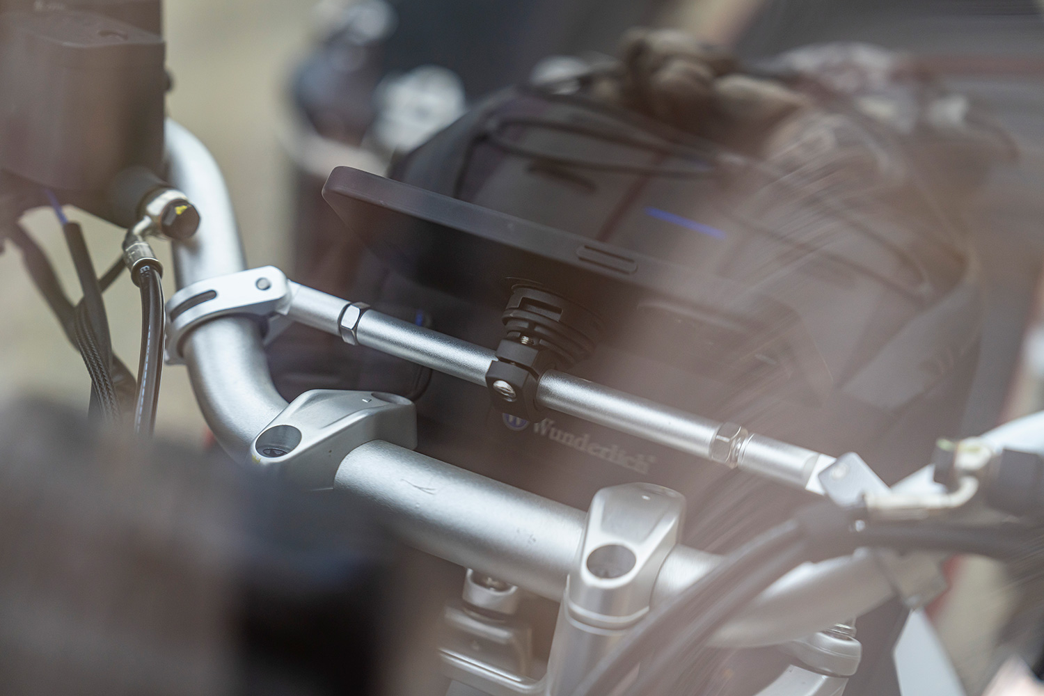 Die hochwertige Lenkermittelstrebe besteht aus glasperlengestrahltem und pulverbeschichtetem Aluminium. Die Querstrebe mit 12 Millimeter Durchmesser ist mit zwei hochwertig aus dem Vollen gefrästen Klemmungen aus Aluminium ausgestattet. Eine spezielle Einlage aus einem Elastomer wirkt besonders vibrationsdämpfend wirkt. Damit unterstreicht die Lenkermittelstrebe nicht nur den authentischen Adventure Look, sondern dient auch als perfekte Befestigungsmöglichkeit für jegliches Zubehör.