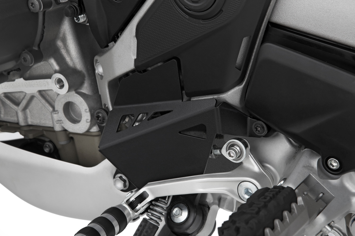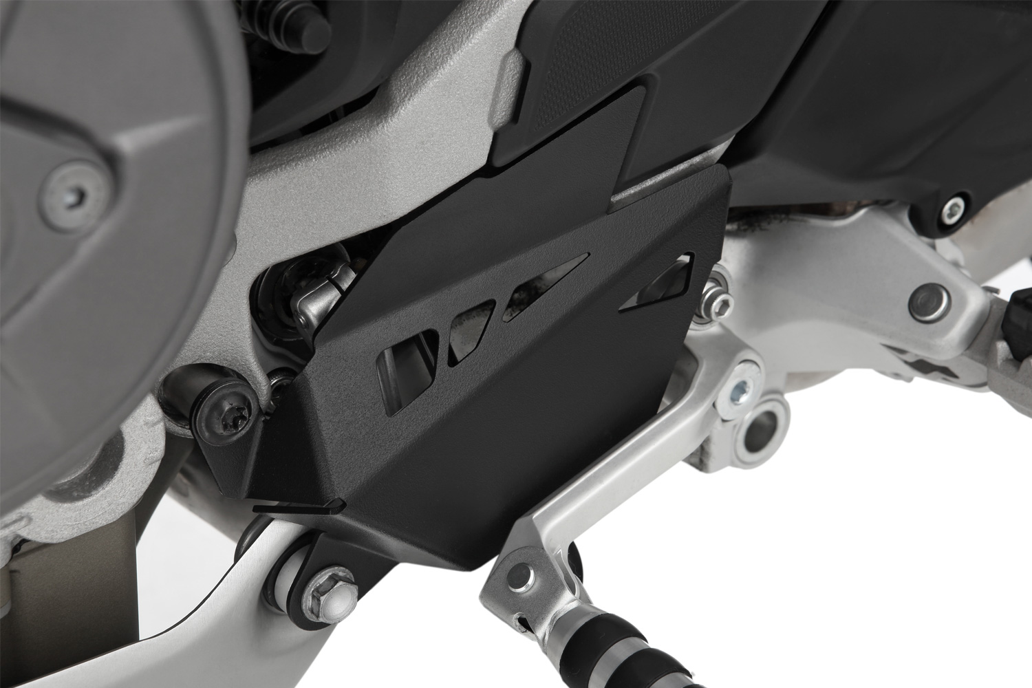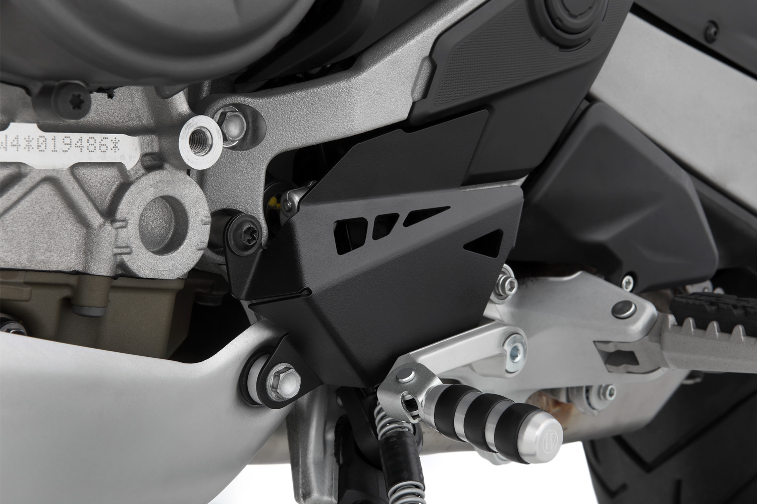 Solide Schutzabdeckung für den Schaltmechanismus, die durch ihr Design sehr sportlich anmutet und sich perfekt ins Adventure-Bike-Design der Multistrada einfügt. Die hohe Schutzwirkung ergibt sich aus der Steifigkeit des gekanteten, teils durchbrochenem, passgenau eingefügten 2 mm-Aluminiumblechs. Damit wird die Gefahr der mechanischen Beschädigung der Schaltmechanik im Alltag, besonders im engagierten Offroadeinsatz zuverlässig reduziert. Gleichzeitig schützt sie vor Schmutz und damit auch vor unnötigem Verschleiß. Die Montage erfolgt unkompliziert an drei vorhandenen, gut zugänglichen Befestigungspunkten.
